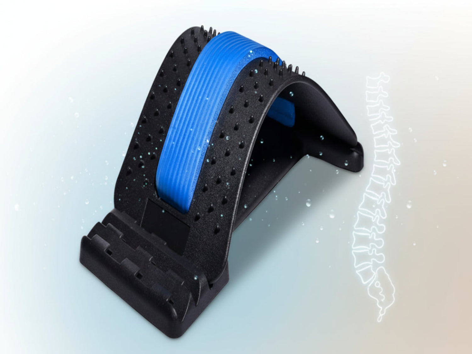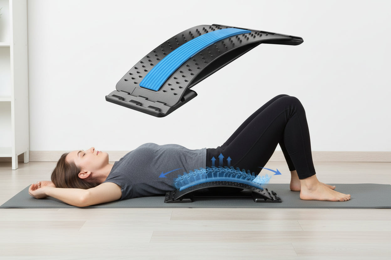 El arco aplica una ligera descompresión en la zona lumbar ayudando a liberar la tensión acumulada por malas posturas o largas horas sentado.